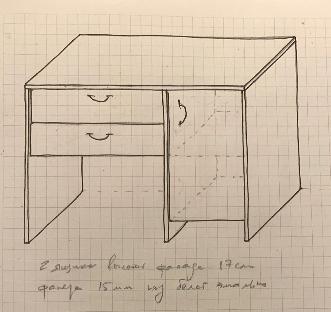 Влагостойкая фанера, белая эмаль, лак. Направляющие скрытого монтажа, петли с доводчиками, прямоугольные ручки-выпилы.