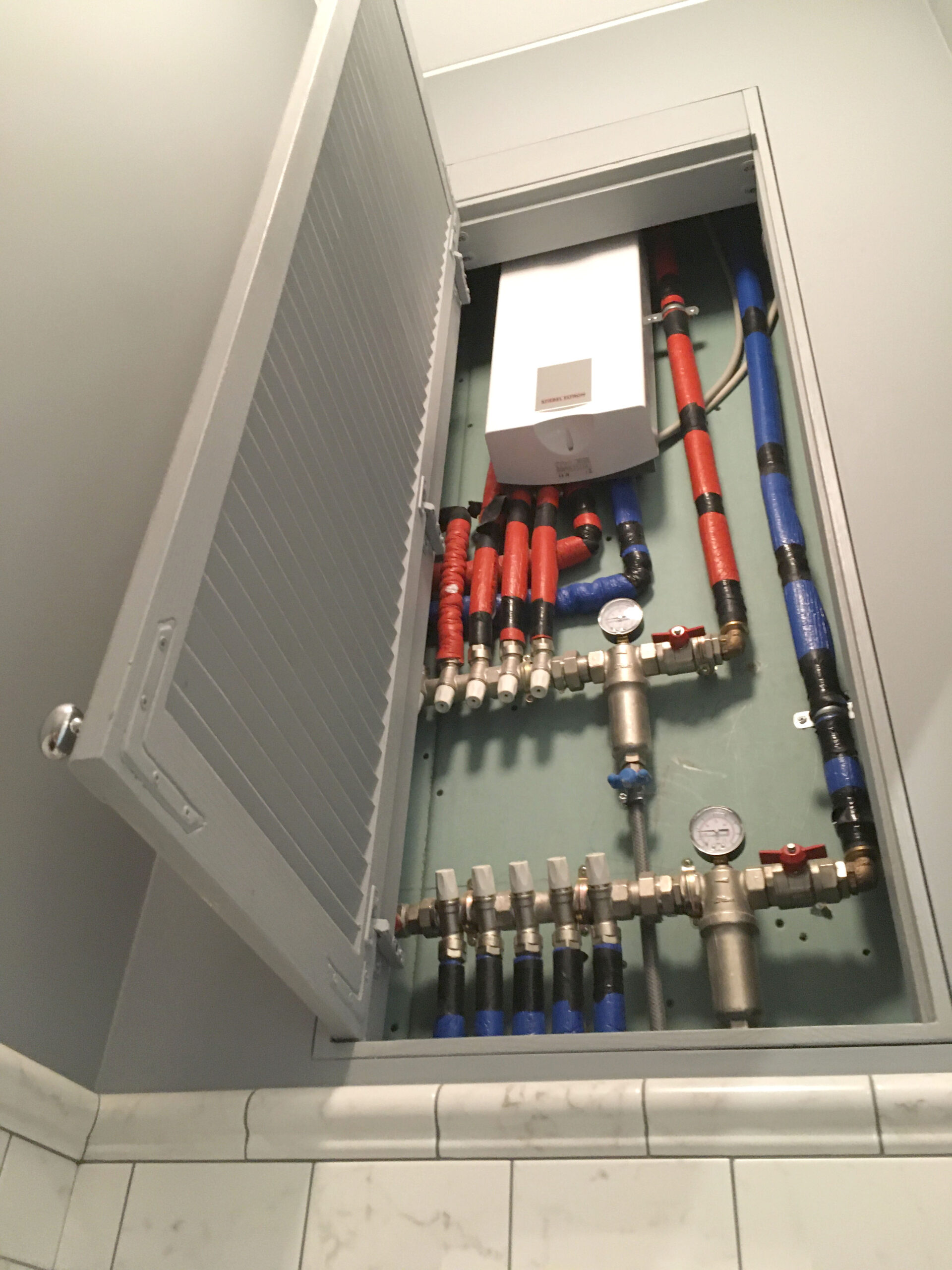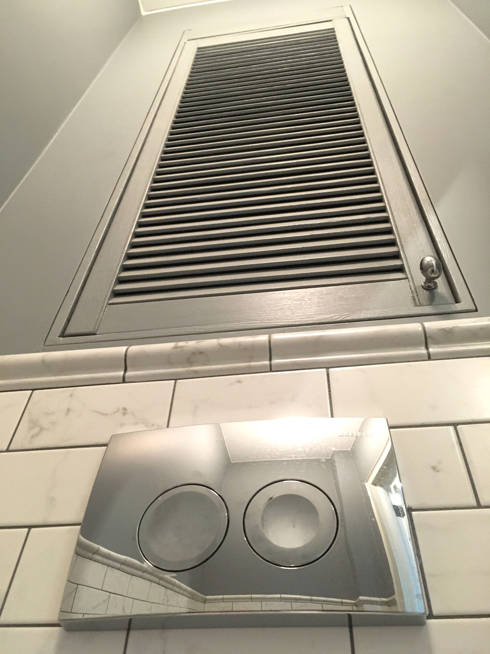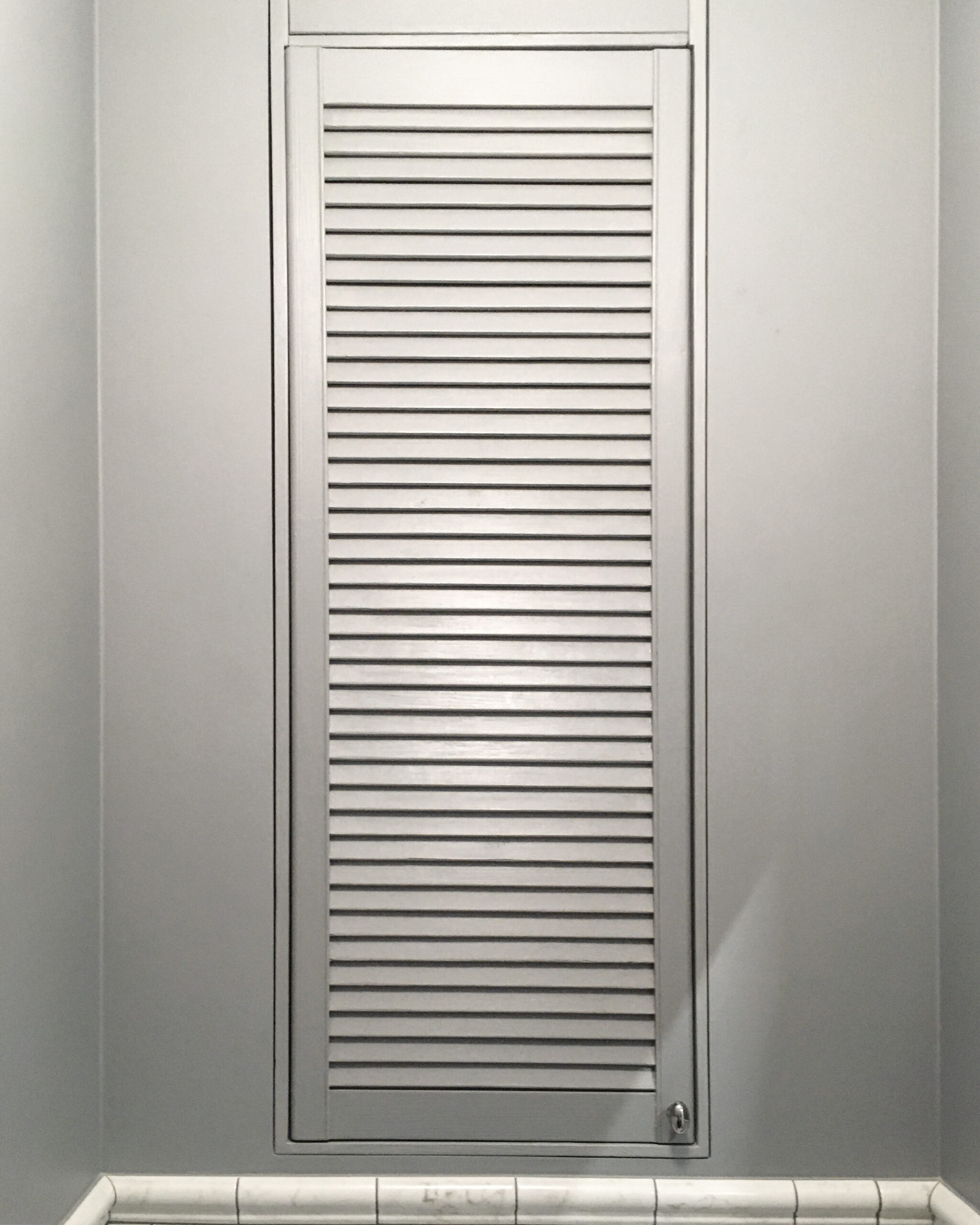 Маленькая жалюзийная дверь в серой стене. Служебная дверца для ниши в ванной комнате.