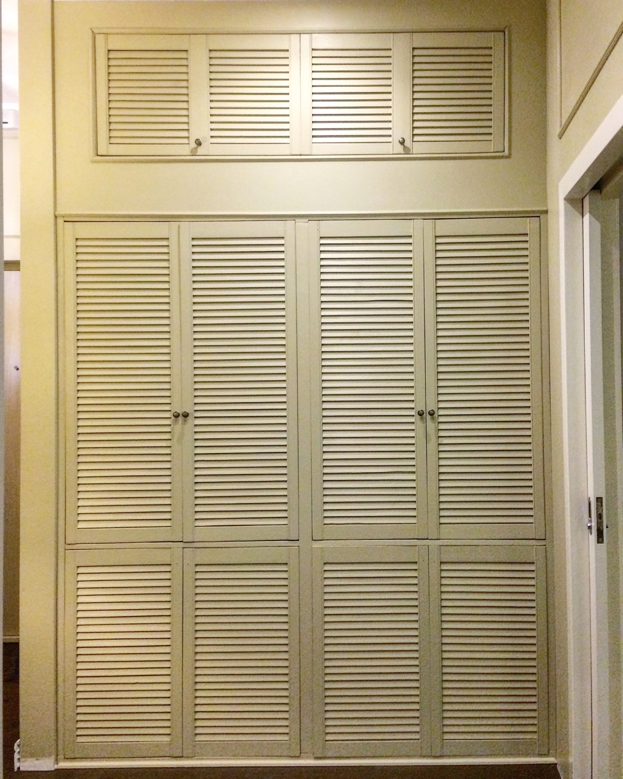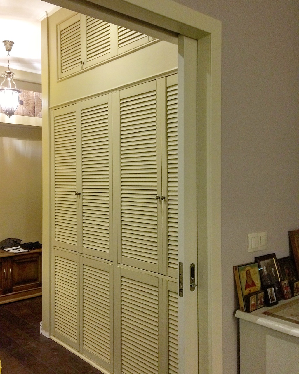 Наполнение — полки из соснового щита и штанги из березы. Сосновые жалюзийные двери, переклеенные и укрепленные, покрыты эмалью в цвет стен. Петли с доводчиками, двери антресоли открываются вверх на подъемных механизмах с амортизаторами.